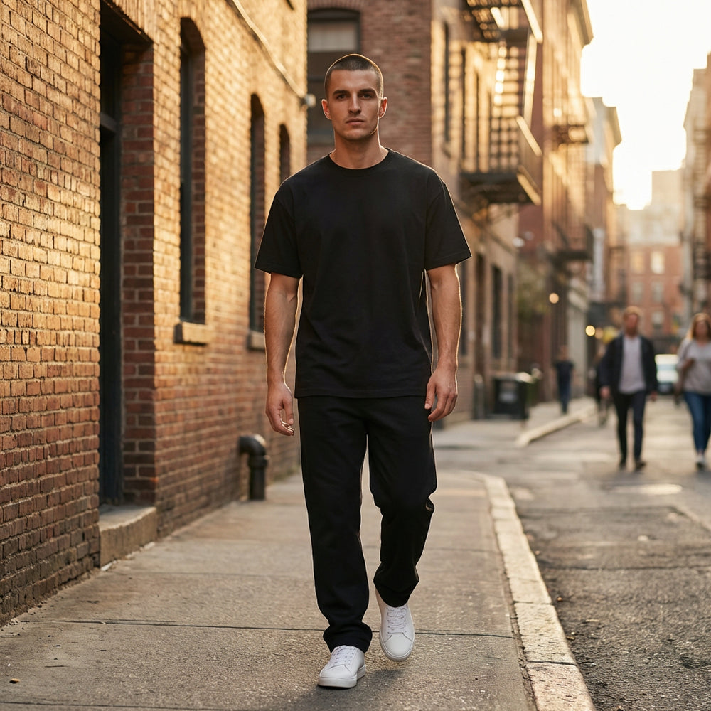 Answer 2: At 250 GSM (7.4 oz), this fabric is a mid-heavy weight cotton. It feels more substantial and durable than a standard thin t-shirt, providing better structure and a premium drape while remaining comfortable for year-round wear.